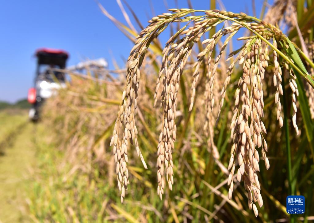 10月21日,在安徽省巢湖市中垾鎮和兵家庭農場(chǎng),農機手操作收割機在田間收割水稻。