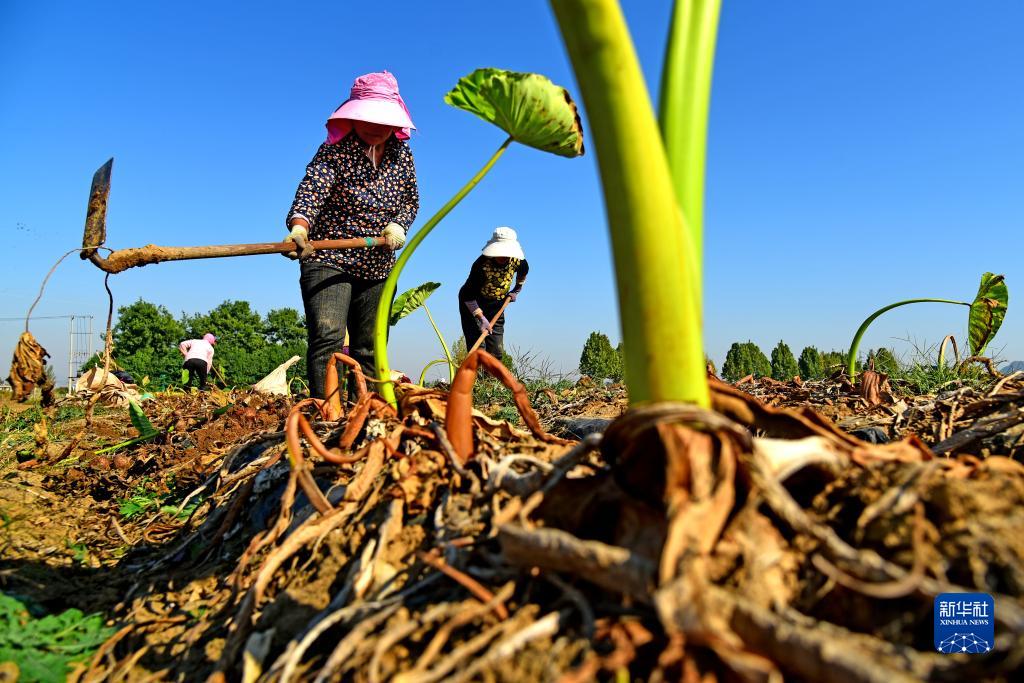 10月21日,山東省棗莊市山亭區城頭鎮荒溝村農民在田間收獲毛芋頭。