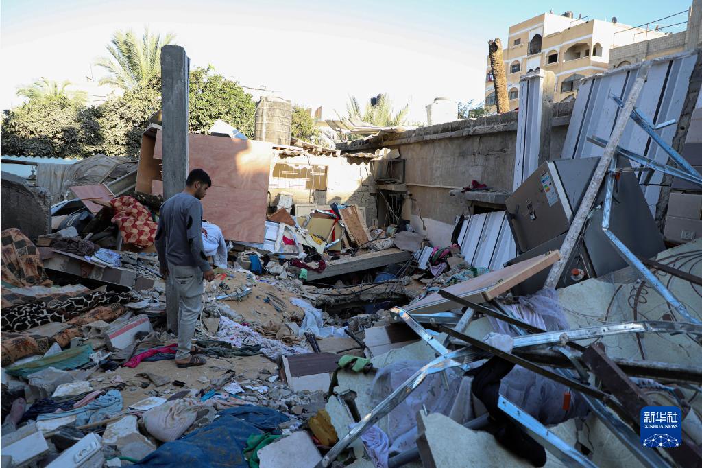 10月21日,在加沙地帶南部城市汗尤尼斯,一名男子站在遭以色列襲擊的建筑廢墟間。