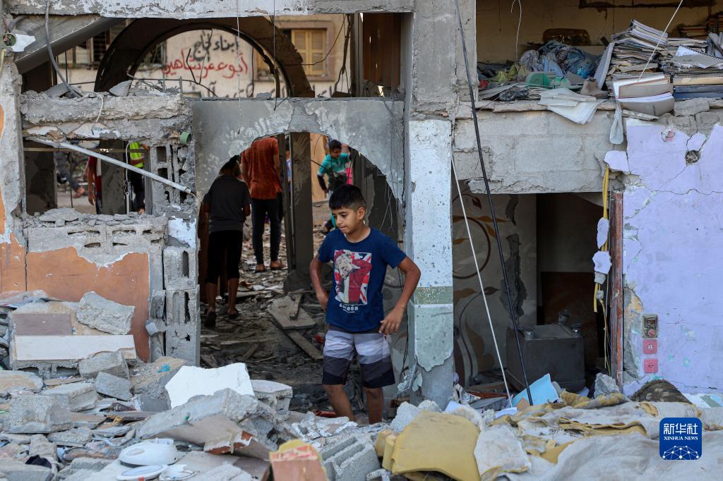 10月21日,在加沙地帶南部城市汗尤尼斯,一名兒童站在遭以色列襲擊的建筑廢墟上。