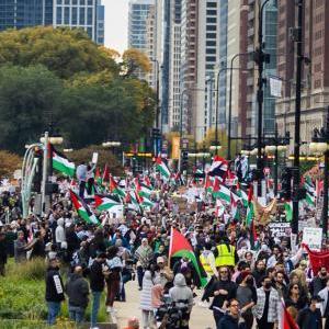 當天,芝加哥民眾走上街頭參加游行活動(dòng),表達對巴勒斯坦人民的支持,抗議以色列對加沙地帶的封鎖。