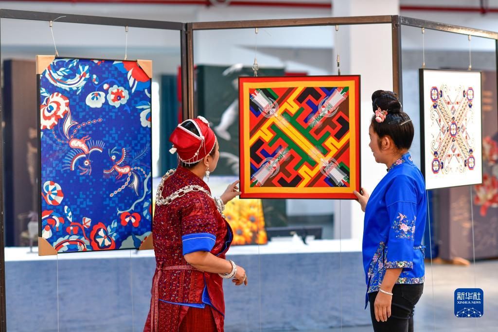 龍祿穎(左)與公司員工在苗繡產(chǎn)品數字化云生產(chǎn)車(chē)間查看刺繡室內裝飾畫(huà)(10月18日攝)。