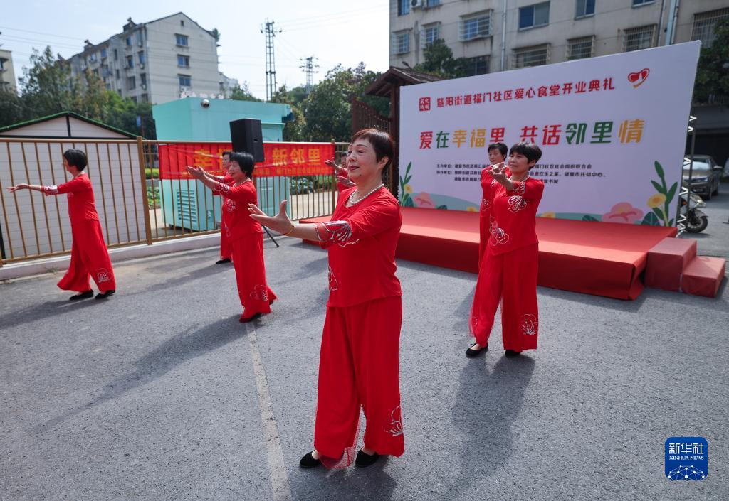 10月22日,在諸暨市暨陽(yáng)街道福門(mén)社區愛(ài)心食堂前,老人參加重陽(yáng)節文藝表演。