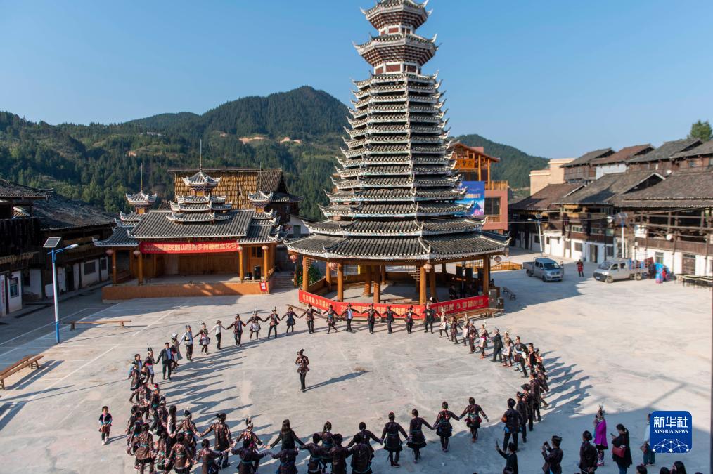 10月22日,侗族同胞與客人在貴州省從江縣2023年首屆天鵝山最美鄉村敬老文化節上演唱侗族大歌跳多耶團結舞。