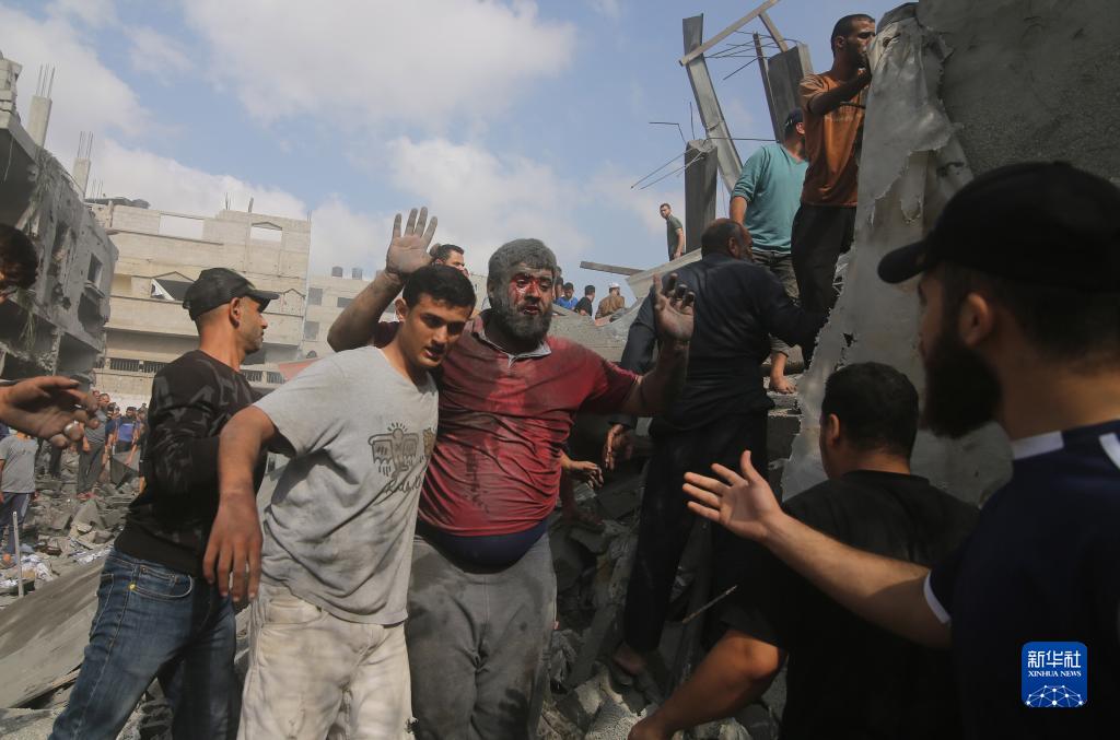 10月22日,在加沙地帶南部城市拉法,人們在遭以色列襲擊損毀的建筑廢墟上救援。