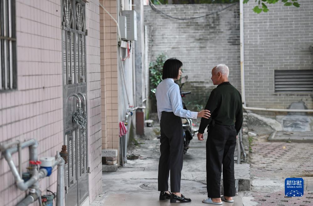 陸秀興(左)在古灶村里與老人聊天,了解老人生活情況(10月17日攝)。