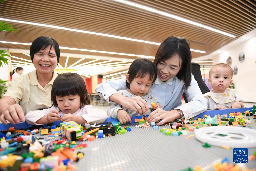 陸秀興(右二)在古灶村黨群服務(wù)中心陪村里的孩子玩積木(10月17日攝)。