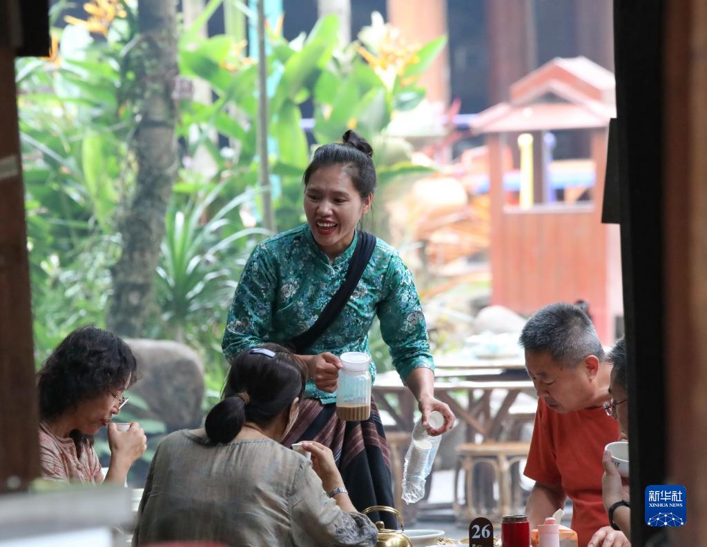 10月22日,在云南省景洪市曼聽(tīng)村村民經(jīng)營(yíng)的一處“傣家樂(lè )”,村民為就餐的游客服務(wù)。