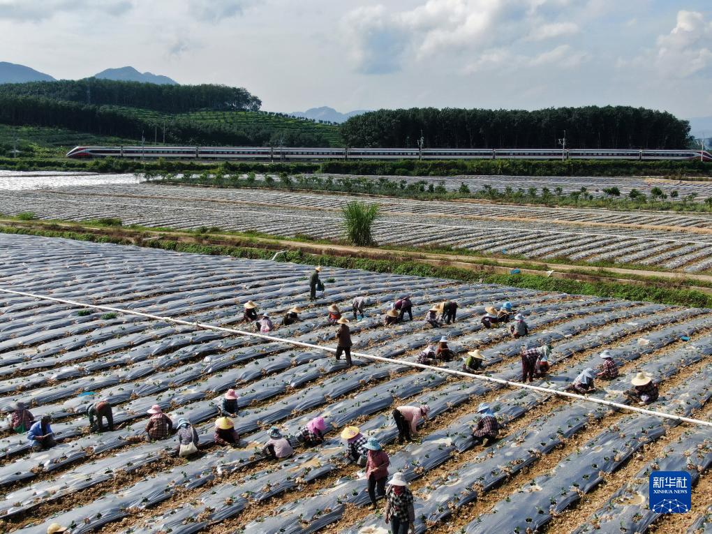 10月21日,云南省景洪市勐罕鎮村民在一家種植基地務(wù)工,身后的中老鐵路上動(dòng)車(chē)飛馳而過(guò)(無(wú)人機照片)。
