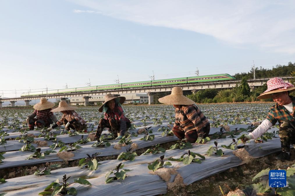 10月20日,云南省景洪市勐罕鎮村民在一處種植基地務(wù)工,身后的中老鐵路上動(dòng)車(chē)飛馳。