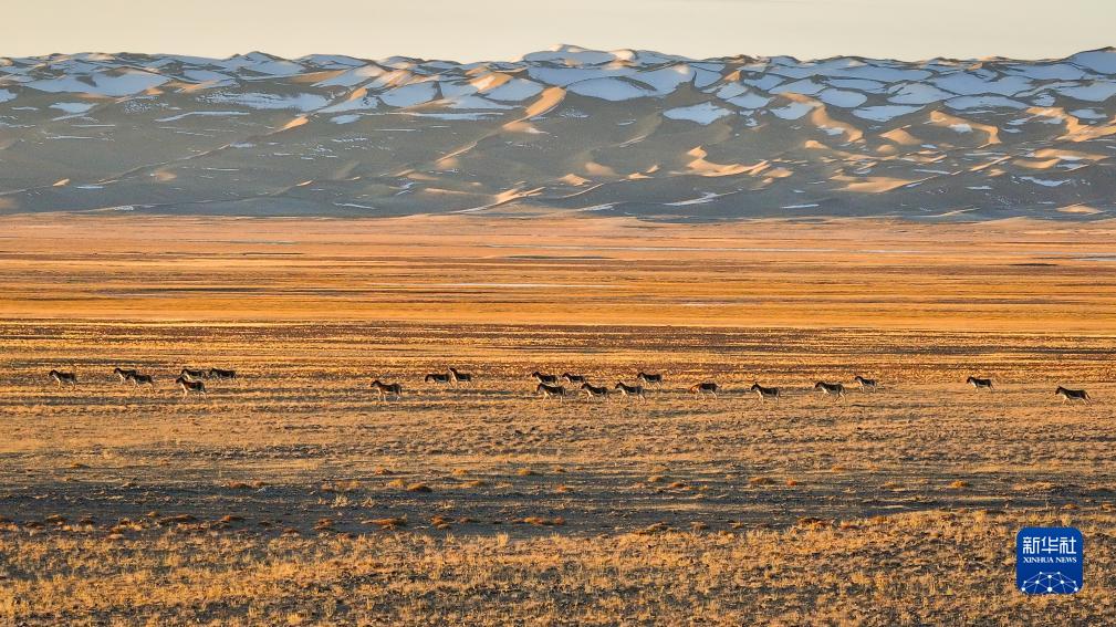 10月18日,在阿爾金山國家級自然保護區,藏野驢在灑滿(mǎn)陽(yáng)光的草原上奔馳(無(wú)人機照片)。