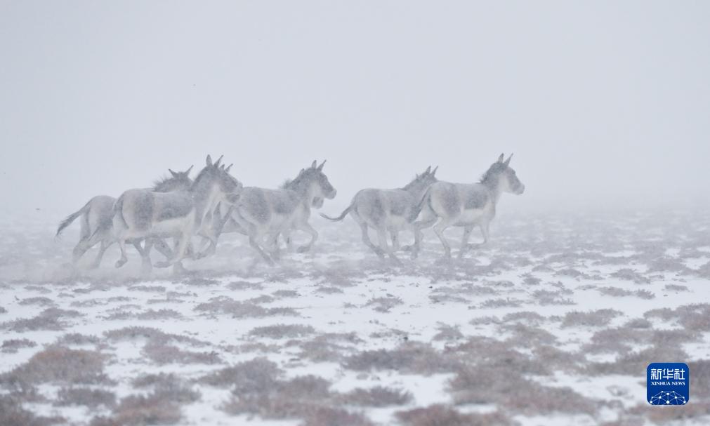 10月16日,在阿爾金山國家級自然保護區,藏野驢在雪中奔馳。
