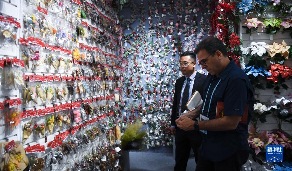 10月23日,外國采購商在飾品展臺洽談業(yè)務(wù)。