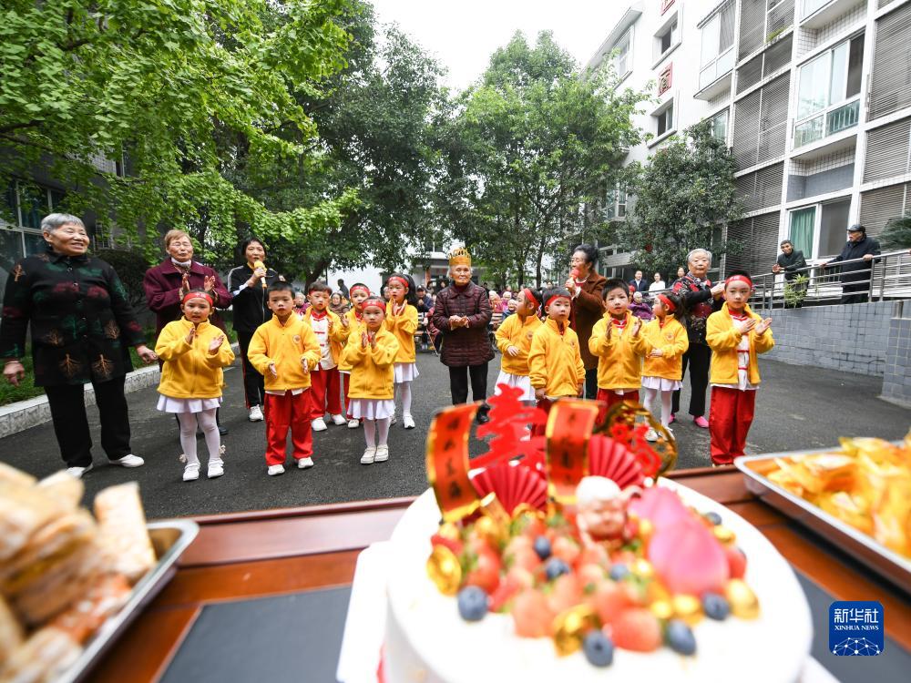 10月20日,在四川省眉山市彭山區社會(huì )福利院,彭山區幼兒園的小朋友一起為趙鳳章老奶奶(中)祝壽。