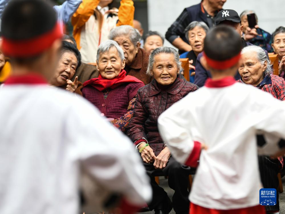 10月20日,在四川省眉山市彭山區社會(huì )福利院,趙鳳章老奶奶(后右二)在觀(guān)看彭山區幼兒園的小朋友表演的節目。