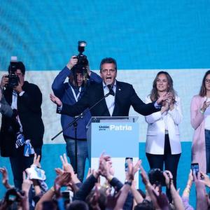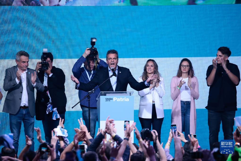 10月22日,阿根廷中左翼執政聯(lián)盟祖國聯(lián)盟候選人、現任經(jīng)濟部長(cháng)塞爾希奧·馬薩(中)在位于首都布宜諾斯艾利斯的競選總部發(fā)表演說(shuō)。