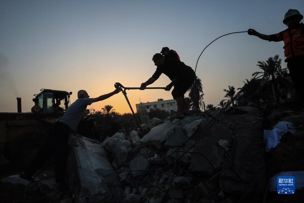 10月23日,在加沙地帶南部城市汗尤尼斯,人們在遭以色列襲擊后的建筑廢墟上救援。