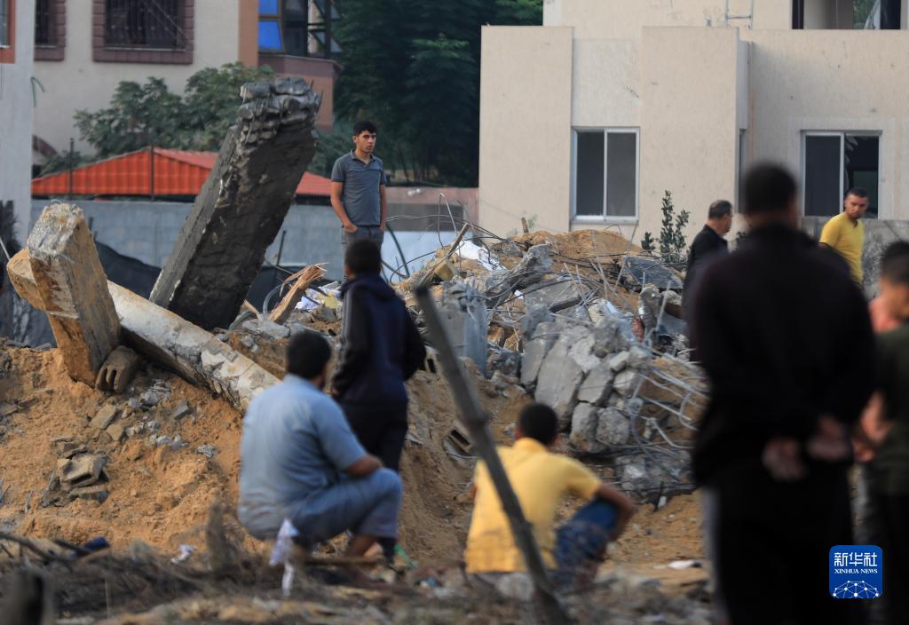 10月23日,人們在加沙地帶南部城市汗尤尼斯查看遭以色列空襲后的建筑廢墟。