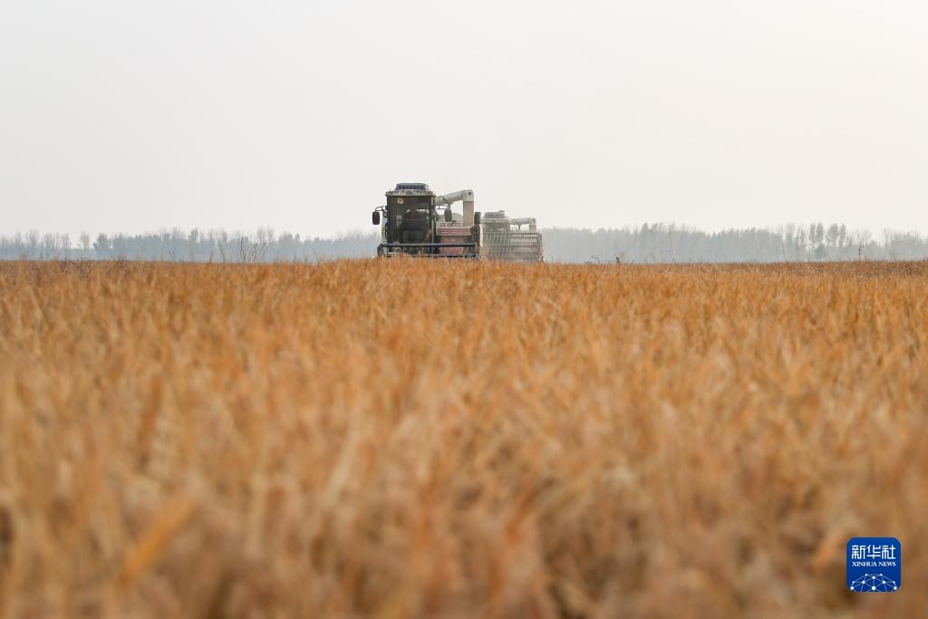 10月23日,水稻收割機在彰武縣大冷鎮上三家子村的稻田中收割水稻。