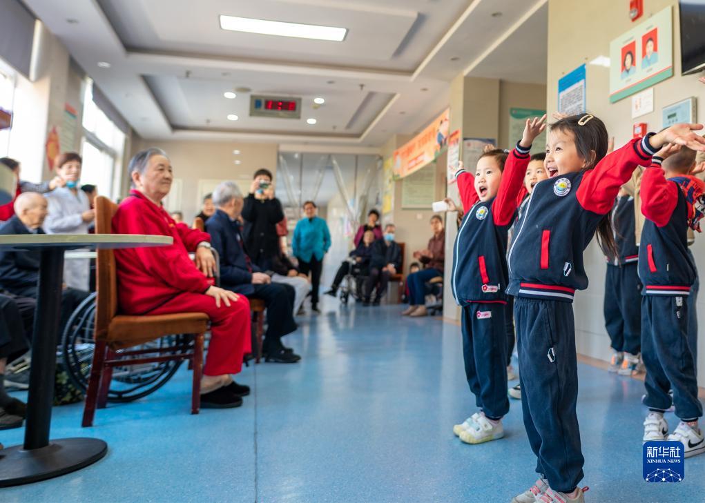 10月23日,在江蘇省興化市昭陽(yáng)湖幼兒園,小朋友給老人們表演節目。
