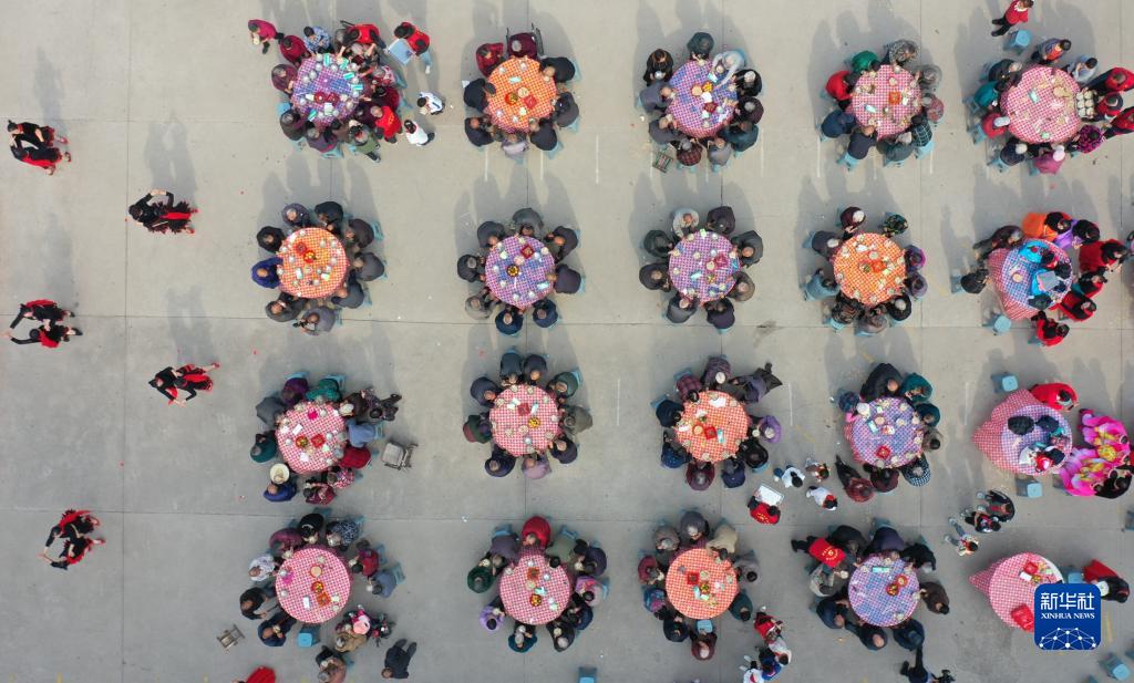 10月23日,在河北省石家莊市欒城區北趙臺村,老人們參加“慶重陽(yáng)節 孝親敬老”餃子宴活動(dòng)(無(wú)人機照片)。
