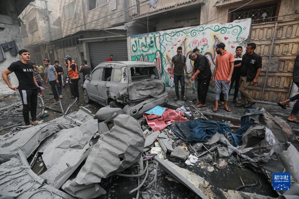 10月23日,人們在加沙城查看空襲后的受損建筑和車(chē)輛。