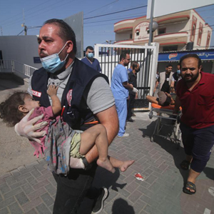 10月23日,在加沙地帶南部城市拉法,人們將傷者送往醫院。