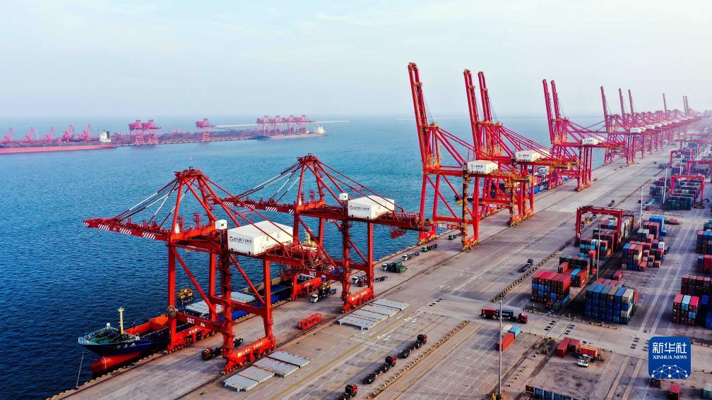 10月23日,船舶在山東港口日照港集裝箱碼頭??孔鳂I(yè)(無(wú)人機照片)。