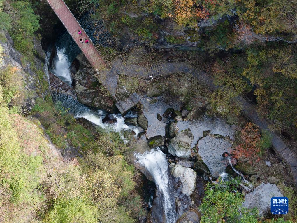 10月21日,游客在位于朱家灣村的牛背梁國家森林公園內游覽(無(wú)人機照片)。