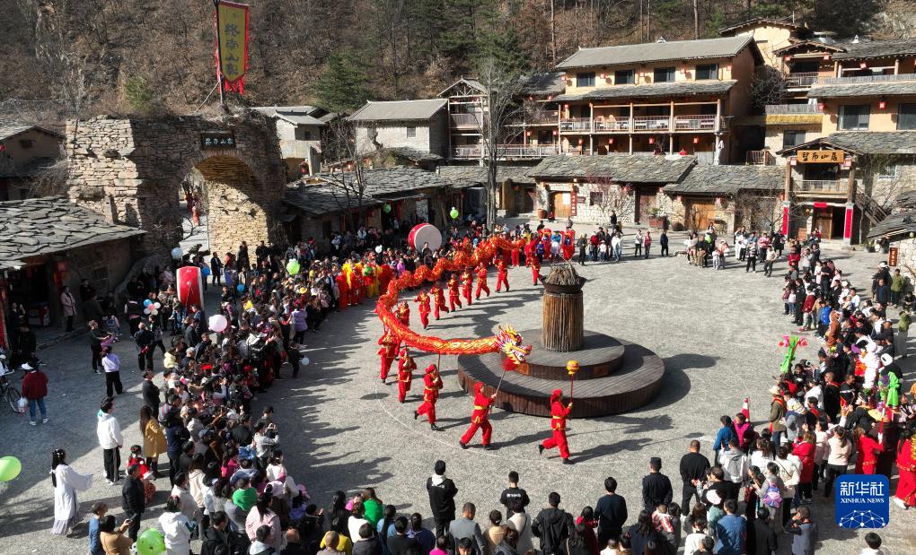 游客在朱家灣村終南山寨民俗文化村觀(guān)看舞龍表演(3月4日攝,無(wú)人機照片)。