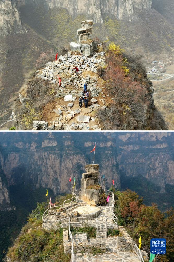 拼版照片:上圖為在壺關(guān)縣大峽谷鎮青龍峽村,村民們在山上修路(3月23日攝,無(wú)人機照片);下圖為修好的旅游步道(10月18日攝,無(wú)人機照片)。