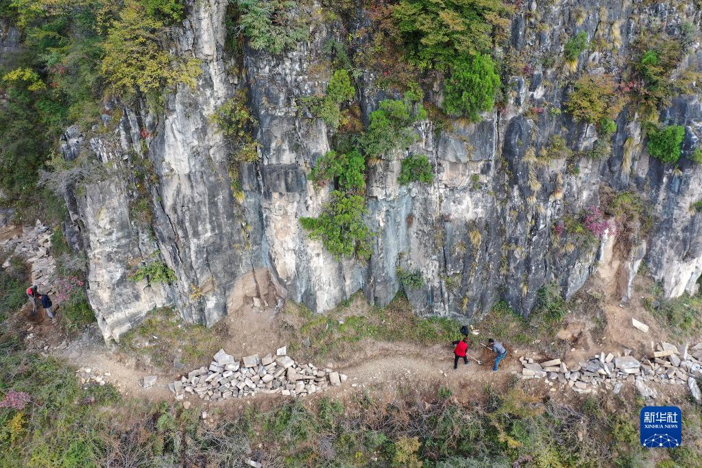村民們在太行山上修路(10月18日攝,無(wú)人機照片)。