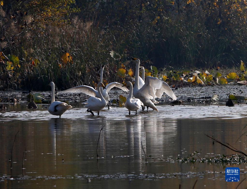 10月24日,大天鵝在三門(mén)峽市天鵝湖國家城市濕地公園內棲息。
