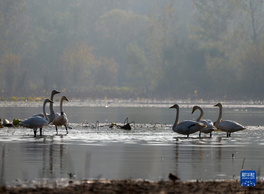 10月24日,大天鵝在三門(mén)峽市天鵝湖國家城市濕地公園內棲息。