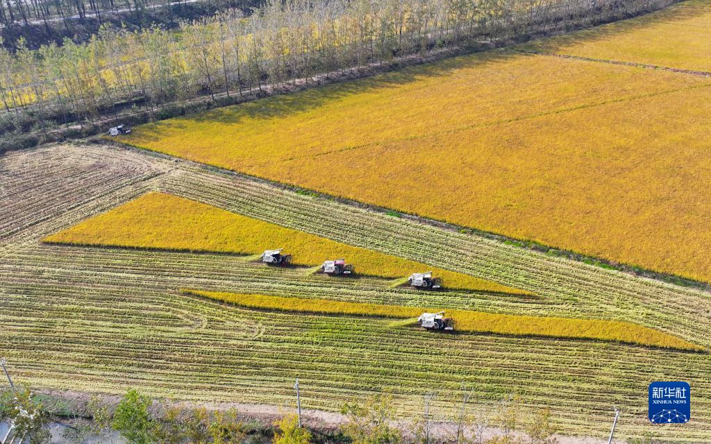 10月24日,江蘇省淮安市洪澤區三河鎮草橋村農民駕駛農機收割水稻(無(wú)人機照片)。