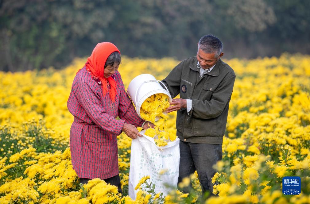 10月24日,江蘇省興化市林湖鄉西丁村村民將采摘的菊花裝袋。