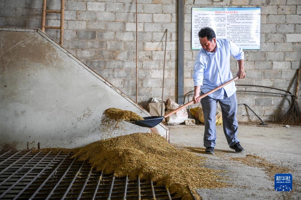 10月24日,在廣西貴港市港北區大圩鎮,村民將稻谷投入烘干機。