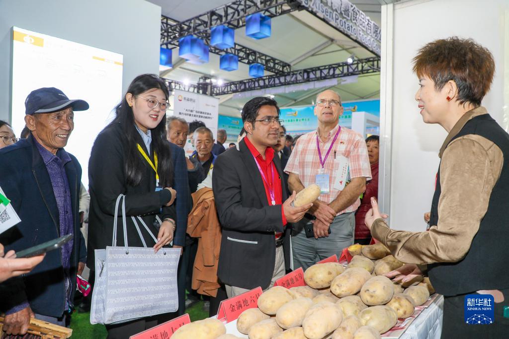 10月23日,在山東省滕州市大塢鎮展會(huì )現場(chǎng),國外客商在了解馬鈴薯品種。