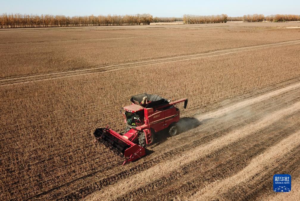 這是10月11日拍攝的收割機在黑龍江省富錦市收獲大豆(無(wú)人機照片)。