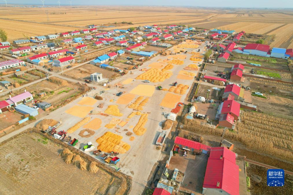 10月24日,在黑龍江省富錦市大榆樹(shù)鎮邵店村,農民把收獲的糧食運到空地上晾曬(無(wú)人機照片)。
