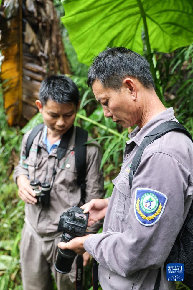 10月18日,海南長(cháng)臂猿監測隊隊員李文永(右)和同事在海南熱帶雨林國家公園霸王嶺片區查看幾天前拍攝的照片。
