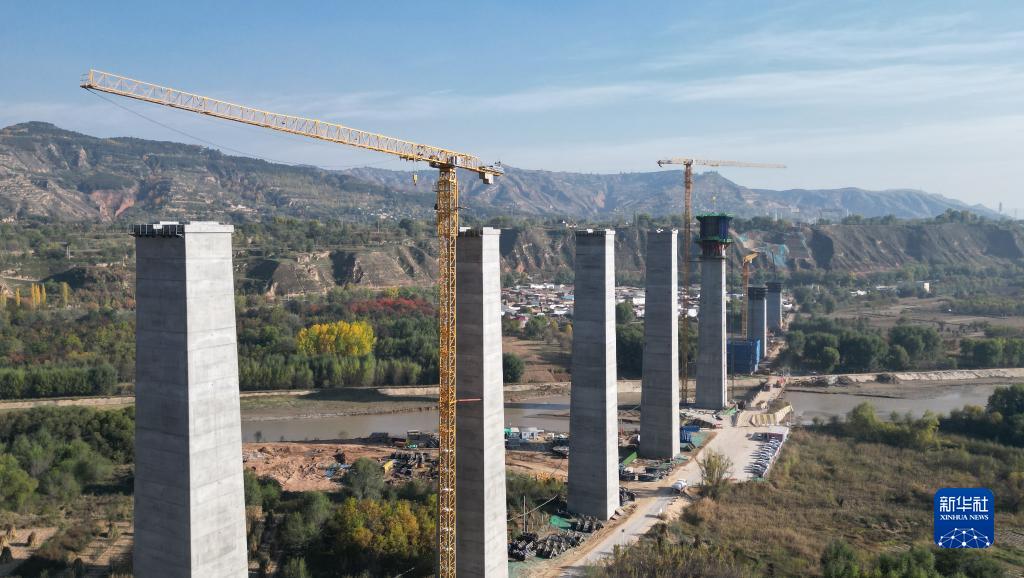 這是10月24日拍攝的位于甘肅臨夏境內的蘭合鐵路4標段北小塬大夏河特大橋墩身施工現場(chǎng)(無(wú)人機照片)。