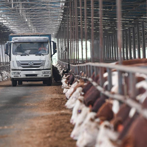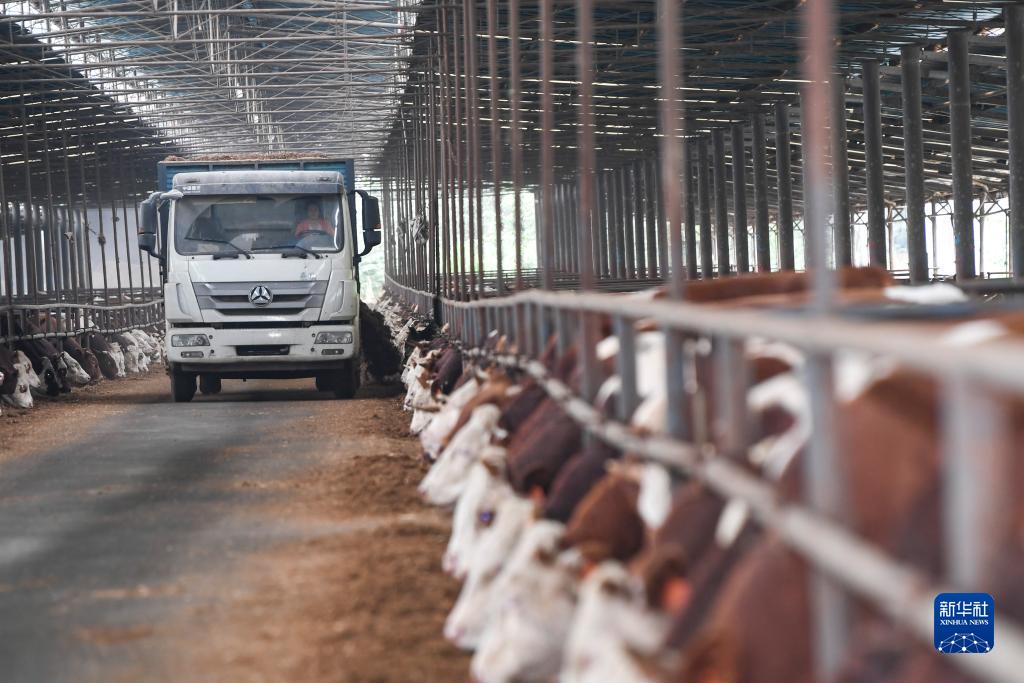 10月23日,在重慶市豐都縣高家鎮厚池壩村肉牛育肥場(chǎng),工作人員駕駛撒料車(chē)給肉牛投料。