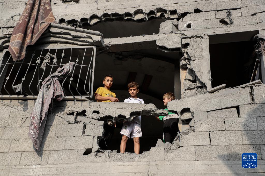 10月25日,在加沙地帶南部城市汗尤尼斯,幾名男孩站在一棟在以色列空襲中被毀的建筑中。