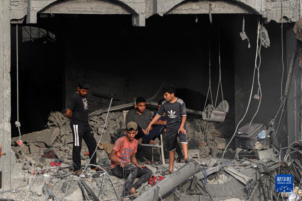 10月25日,在加沙地帶南部城市汗尤尼斯,男孩們待在一棟在以色列空襲中被毀的建筑中。