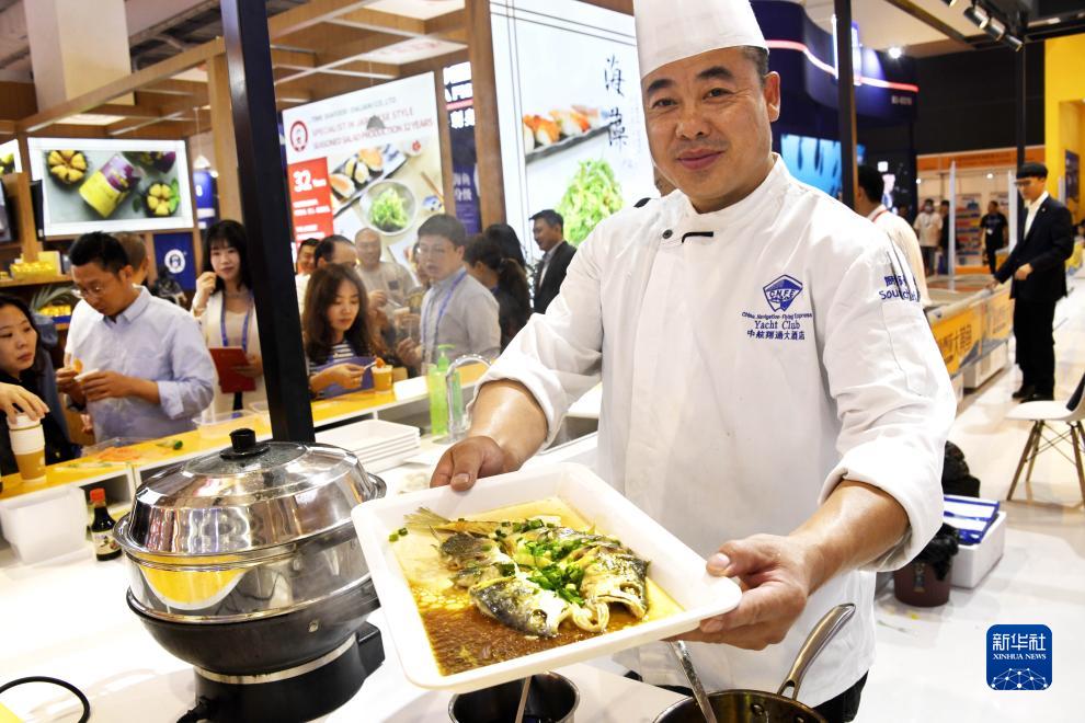10月25日,參展企業(yè)的廚師在漁業(yè)博覽會(huì )上加工水產(chǎn)品。