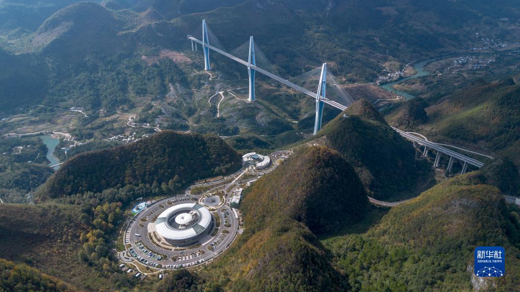這是10月25日拍攝的“天空之橋”觀(guān)光服務(wù)區和平塘特大橋(無(wú)人機照片)。