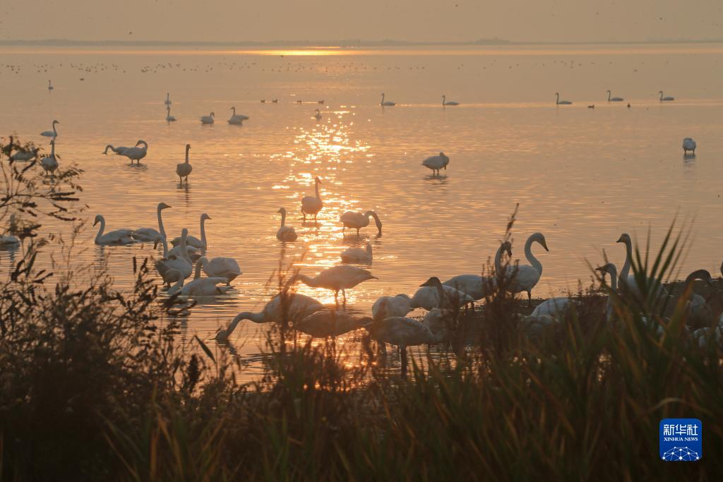 當日,在山東省榮成市天鵝湖,天鵝沐浴晨光,與湖光山色構成詩(shī)情畫(huà)意的美景。