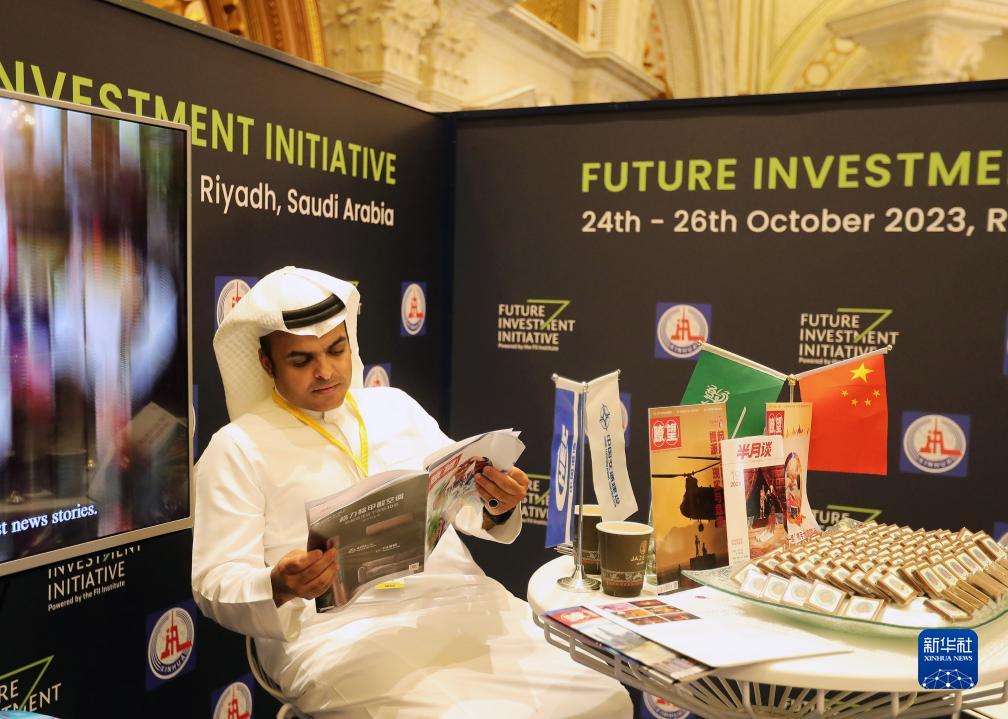 10月24日,在沙特阿拉伯首都利雅得,一名男子在第七屆沙特“未來(lái)投資倡議”大會(huì )會(huì )場(chǎng)的新華社展臺看雜志。