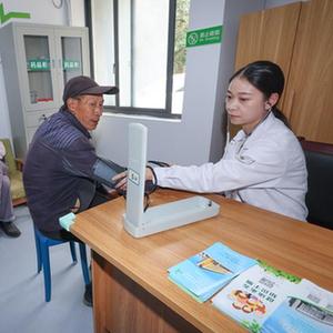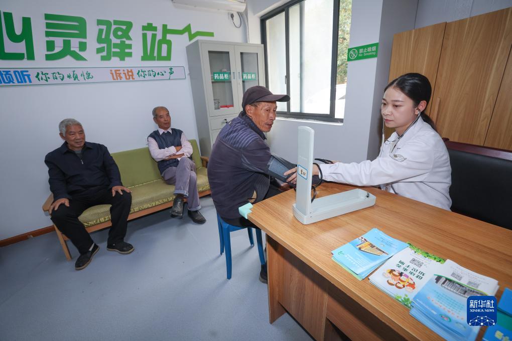 10月26日,在杭州市富陽(yáng)區湖源鄉居家養老服務(wù)中心,社區衛生服務(wù)中心醫生為老年人測量血壓。